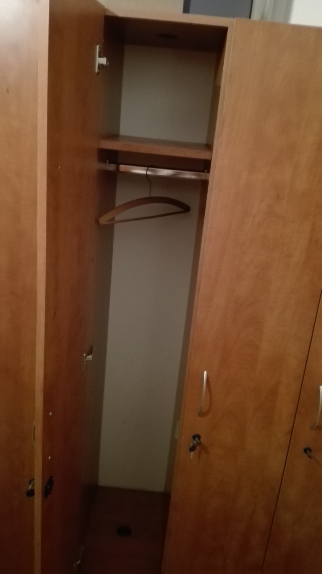 Prodám uzamykatelné šatní skříňky a uzam. skříňky na materiál. Šatní skříň - výška 200cm, šířka 1x66cm, 1x33cm, hloubka 50cm.Škříňka na materiál - výška 200cm, šířka 1x45,5cm, 1x91cm, hloubka 60cm, na levé straně je směrem dozadu mírně zůžená. Dále prodám věšák a sklápěcí stolek.