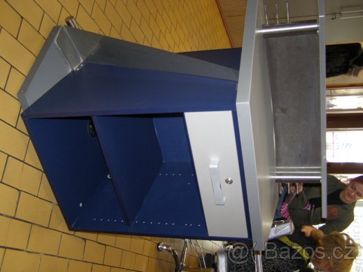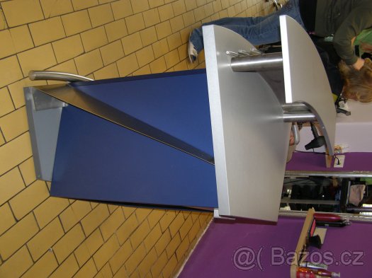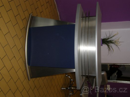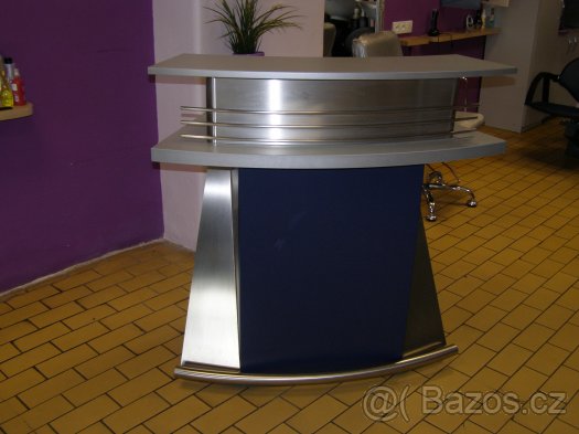 Modrostříbrná čtvrtkruhová recepce s nerezovými doplňky, rampou a uzamykatelnou zásůvkou. Vhodná do vstupních prostor penzionu, kadeřnictví, solárií a.t.d.Původní cena 39000,- Kč